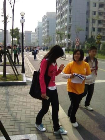 中午,大红的横幅已经拉起,宣传海报已经挂妥,志愿者们各就各位。11:30,伴着下课铃声的响起,志愿者们也忙碌起来。两人一组,一人分发精美的宣传单,另一人用相机留下一张张美丽的笑脸。同学们积极参与活动,更有热情的同学主动加入到志愿者队伍中,这大大激励了志愿者,工作的热情一路高涨,变得越来越自信。