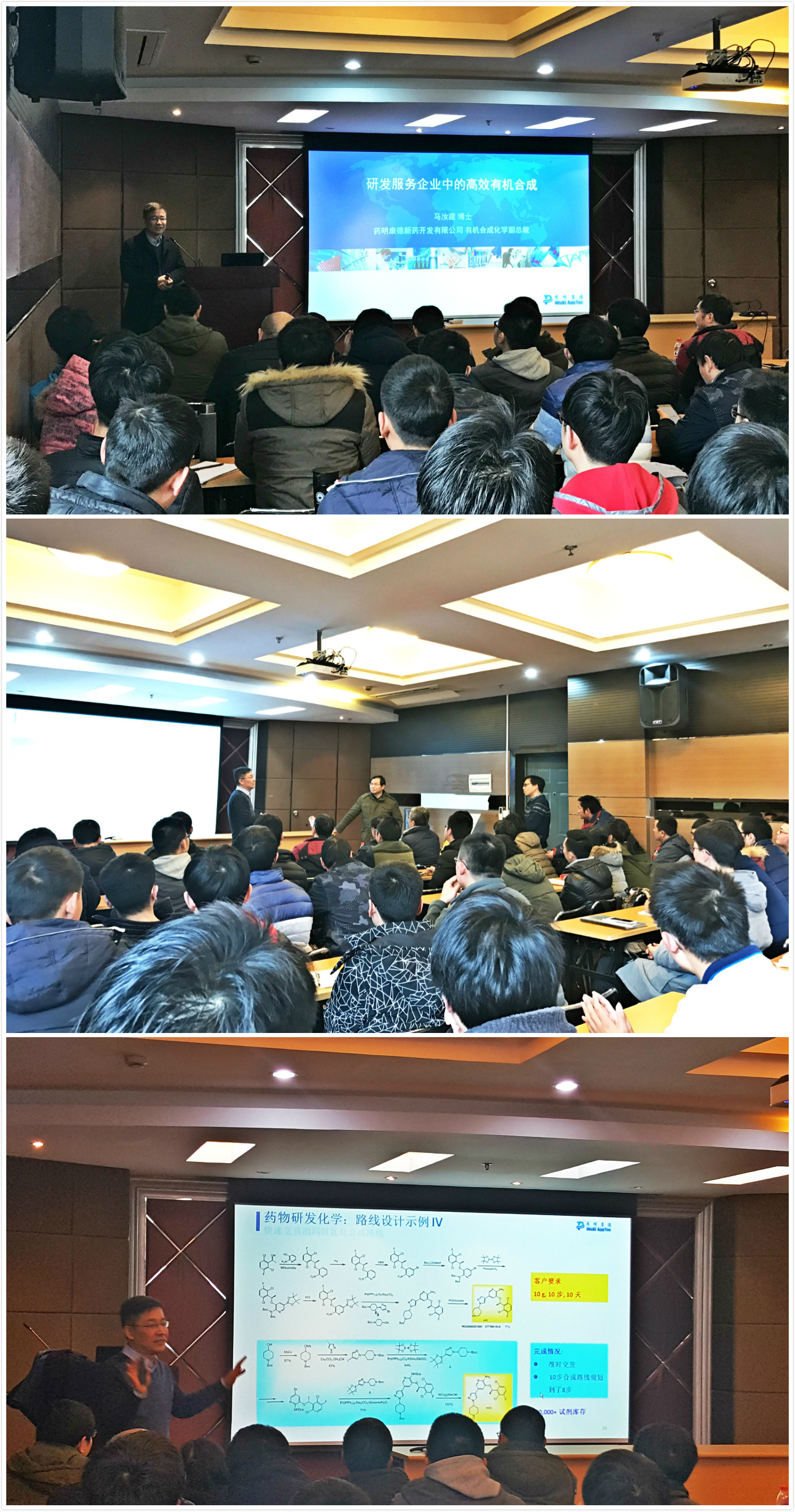 马汝建博士结合自己在药明康德新药开发有限公司16年的工作经验,从药明康德的发展历程深入剖析了全球医药行业的发展现状,详细介绍了新药研发外包服务类企业(Contract Research Organization,简称CRO)在新药研制中的角色;同时还详细介绍了许多其在工作中遇到的案列,向师生们展示了如何巧妙的设计合成路线,以最短的时间,最低的成本来得到目标产品。报告最后,马汝建博士与参会的师生就制药职业规划以及学术问题进行了热烈的交流。