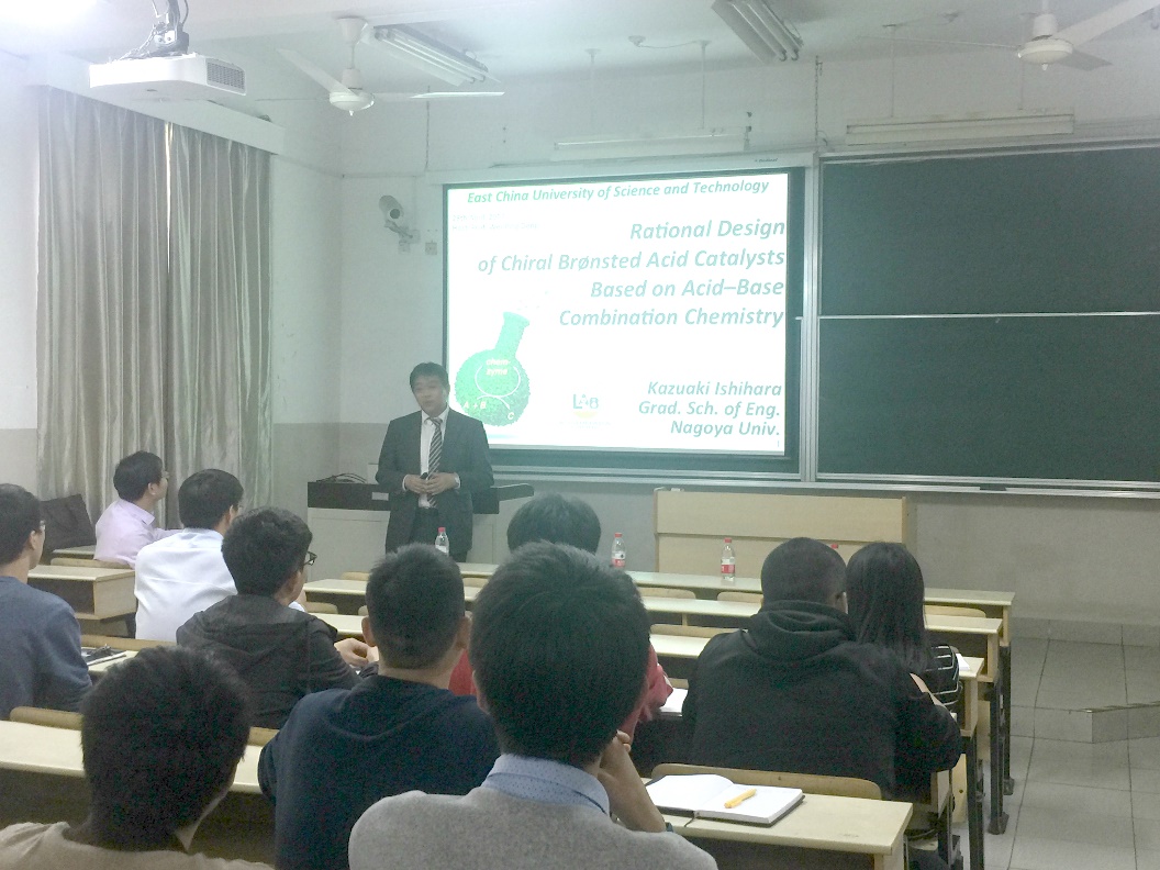 4月28日下午,日本名古屋大学Kazuaki Ishihara教授应邓卫平教授的邀请访问永利集团官网,并做了题为“Rational Design ofChiralBrønstedAcid Catalysts Based on Acid-Base Combination Chemistry”的学术报告。报告会由邓卫平教授主持。永利集团官网李浩,虞心红,杨友等教授,以及化学院相关老师和部分研究生参加了这次会议。