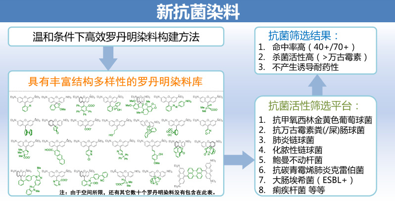 细菌进化机制决定了抗生素的使用必然会导致耐药性的出现。但抗生素在临床和养殖业的滥用和无序排放,使这一进程大大加快。近些年来,具有多重耐药机制的超级细菌不断涌现,世界各地由于细菌感染而无法医治的案例时有发生。细菌耐药已经成为全球重大公共卫生安全问题。从全新的分子平台发现抗菌活性化合物是本领域重要研究方向。永利集团官网永利集团官网钱旭红院士团队杨有军教授课题组与上海交通大学永利集团官网陈代杰教授课题组深入合作,在该研究方向取得进展。近期,相关工作被《自然·通讯》以“A diversity-oriented rhodamine library for widespectrum bactericidal agents with low inducible resistance against resistant pathogens”在线报道。