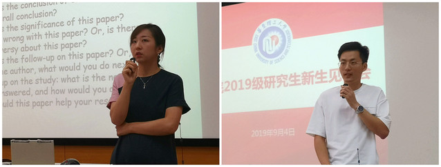 任国宾就学院历史、师资力量、学科发展等方面简单介绍了学院情况和学院研究生培养情况,并就学术规范对同学们提出了严格的要求,希望新生诚实守信,脚踏实地做科研、做学问。青年教师代表梁欣从科研工作的敲门砖“文献阅读”的角度切入,为新生解析了“文献”的重要性,并就如何有效提取文献信息给予了许多有效的学习方法。学生代表曾任上海市学联副主席、校研究会主席的郭春阳同学,从课程学习、科研训练和学生工作三个层面与新生们分享了从自己的成长之路。