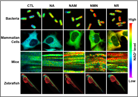 烟酰胺腺嘌呤二核苷酸(NAD+)作为生物体内最重要的辅酶和核心代谢物,不仅广泛参与了能量代谢氧化还原反应,还是直接调控Sirtuins、PARP和CD38等重要酶活性的限制性底物,影响了表观遗传修饰、基因组完整性与信号转导过程。近来许多研究表明NAD+的水平常常伴随机体衰老而降低,而补充NAD+前体则可延缓衰老的进程。因此,在体NAD+水平的测定可帮助预测机体衰老进程和搜寻上调NAD+水平的抗衰老药物。然而,在体NAD+水平的测定无法通过传统生物化学分析方法实现,是本领域有待解决的重要技术挑战。