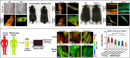 研究进一步发现,巨噬细胞激活过程中NAD+代谢发挥至关重要的作用,下调NAD+合成显著抑制巨噬细胞激活过程中糖酵解水平,炎症因子释放以及生物功能发挥。为了阐明衰老过程中NAD+的代谢情况,研究团队分别从经典的复制性衰老细胞、端粒酶缺失早衰小鼠以及自然性衰老小鼠模型入手,首次以可视化的高清图像,直观地展示了衰老过程中NAD+水平的衰退。尿检是一种常规的医学检测手段,从尿液样品中提取的人源尿液干细胞(hUSC)可部分反映人体的代谢状况。研究通过将FiNad探针导入不同年龄志愿者的hUSC细胞,清晰显示NAD+水平随年龄的增长而逐渐衰减。这一成果实现了一种无创评价人体衰老的全新尝试,使实验室技术和临床诊断无缝衔接,有望使科研成果快速转化应用到大众的医疗保健中,从而制定个性化的保健和诊疗策略。