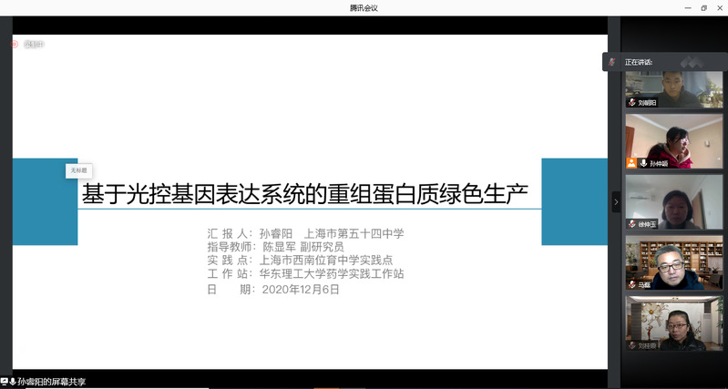 永利集团官网上海市药学实践工作站于近期完成了“第五期上海市青少年创新实践活动”的项目结题工作,由工作站负责人马磊主持,工作站的各位指导老师与管理老师参与,组织来自上海中学、位育中学、西南位育中学和复旦实验中学四个实践点的60名同学们在线完成了结题答辩。本次汇报分两轮进行,首先12月12日学生分为四组进行结题汇报,并推选出14位的学生参加12月19日的推优答辩,最终评选出6名优秀学员。