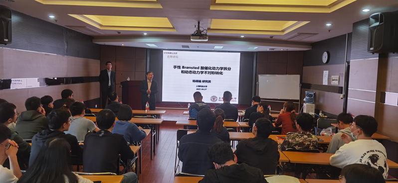 杨晓瑜研究员主要从事不对称有机催化以及糖化学研究。在讲座中,他向在场师生详细介绍了利用手性Brønsted酸催化实现了一系列具有挑战性底物的高效动力学拆分反应,同时也介绍了利用动态动力学不对称转化的策略实现了消旋底物更为高效的不对称催化反应,克服了动力学拆分反应中50%产率的限制。深入而系统的研究工作让在场师生深受启发。
