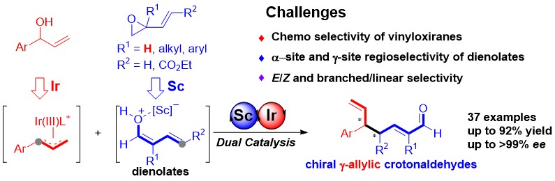 该团队开发了钪/铱双金属协同催化体系,巧妙地利用Meinwald重排反应,令烯基环氧乙烷原位生成二烯醇中间体,作为亲核试剂参与到烯丙基取代反应中,并且表现出专一的γ位点反应选择性,最终以优秀的收率和立体选择得到了一系列高度官能化的手性巴豆醛衍生物。