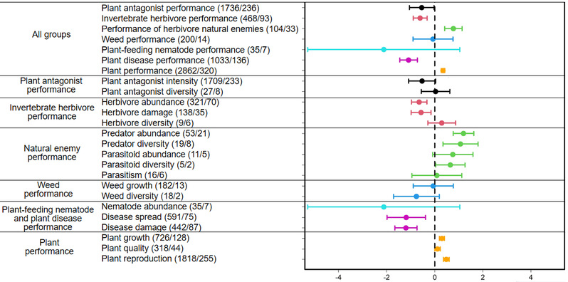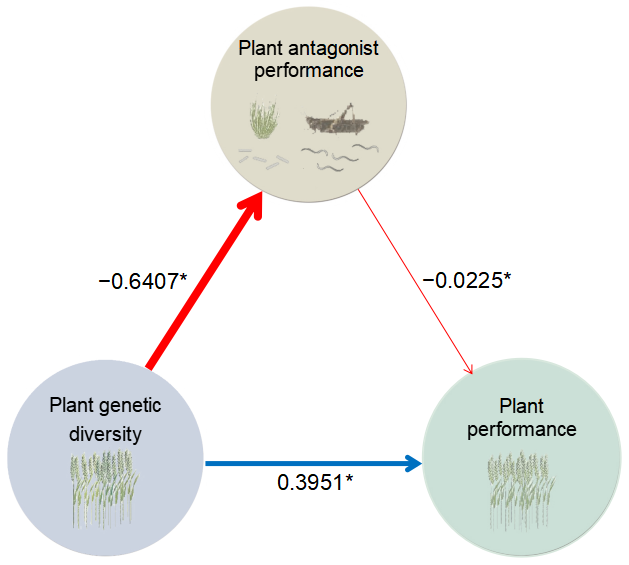 进一步利用结构方程模型量化各营养级功能群之间关系,结果显示:1)在无天敌的作用下,植物基因多样性能够抵抗植物有害生物(病虫草害),使其危害降低,而植物有害生物下降促进了植物的生长发育与繁殖并增强了品质;2)在植物、植食性昆虫、天敌共存的三营养级功能群中,多样化的植物基因有利于天敌,增强了天敌对害虫的控制效果,植物多样性通过提升天敌对害虫的控制能力来增强植物性状。