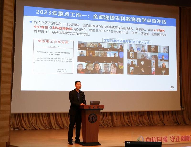 永利集团官网副院长(主持工作)赵玉政教授代表学院行政班子做了永利集团官网2022年度行政工作报告,报告从师资队伍、人才培养、学科建设、科学研究、国际交流与合作等方面,全面回顾了2020年以来永利集团官网取得的突出成绩,着重分析了学院目前面临的机遇和挑战,并对2023年重点工作任务作了部署。在2023年的工作中,永利集团官网将以本科教育教学审核评估,奉贤校区生物医药大楼、实验动物中心和现代产业学院建设为契机,持续推进学科建设、加强师资队伍建设、提高人才培养质量、优化实验室布局、提升产教融合能力、促进国际交流合作,推动学院事业发展再上新台阶。