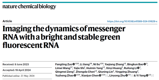 近日,永利集团官网永利集团官网、生物反应器工程国家重点实验室、光遗传学与合成生物学交叉学科研究中心杨弋、朱麟勇、陈显军教授组成的研究团队在活细胞RNA成像技术研究中取得突破性进展,在国际著名学术期刊《自然—化学生物学》(Nature Chemical Biology)以长篇论文(article)形式在线发表题为“Imaging the dynamics of messenger RNA with a bright and stable green fluorescent RNA”的研究论文。