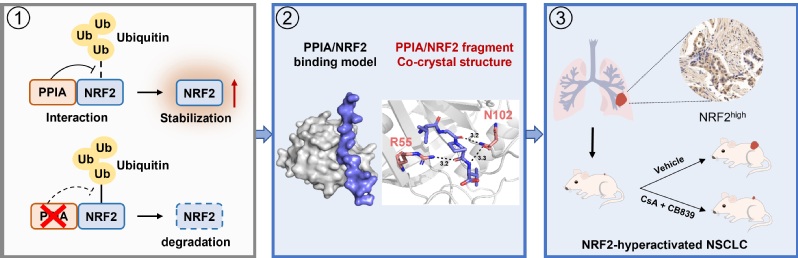 综上,本研究首次发现NRF2的全新相互作用蛋白PPIA,揭示了PPIA稳定NRF2蛋白的机制,提出了靶向干预PPIA/NRF2互作可作为治疗NRF2过度活化肺癌的潜在策略,为后续开发治疗NRF2过度活化的肺癌靶向策略提供了新思路。
