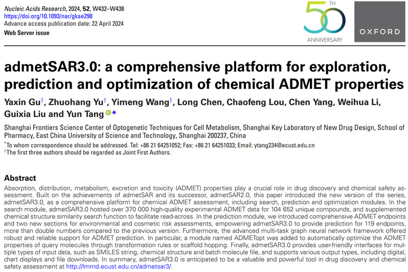 近日,永利集团官网永利集团官网唐赟教授课题组发布了全面升级的化合物ADMET性质综合评估平台admetSAR3.0,该平台能够为化合物ADMET数据搜索、性质预测和优化提供一站式服务,用户可通过如下链接免费使用该平台:http://lmmd.ecust.edu.cn/admetsar3/。相关研究成果以“admetSAR3.0: a comprehensive platform for exploration, prediction and optimization of chemical ADMET properties”为题,发表于国际著名期刊《核酸研究》(Nucleic Acids ResearchIF=16.6)。