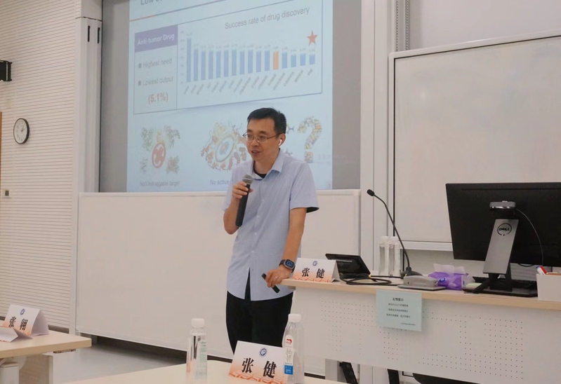 张健作了题为“创新药物设计与发现”的学术报告。张健从国内外创新药物发展面临“投入大、成功率低”的现状出发,以团队对APC-Asef蛋白相互作用机制研究成果为例重点介绍了团队在精准靶标识别和原创药物先导发现方面的工作。