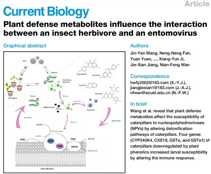 近日,永利集团官网万年峰研究员课题组,联合我国、英国、美国科研人员,阐明了植物多样性介导下植物次生代谢物通过调节昆虫解毒代谢影响病毒杀虫剂杀虫效果的机制,在国际生物学著名期刊Cell子刊—Current Biology上以Articles形式发表了题为“Plant defense metabolites influence the interaction between an insect herbivore and an entomovirus”长篇研究论文。