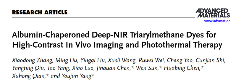 近日,永利集团官网永利集团官网钱旭红院士、杨有军教授团队设计并两步合成具有“螺旋桨构型”的深近红外三芳基甲烷衍生物(EA5系列染料)。利用生物内源性白蛋白对EA5染料进行包封极大地提高了染料的荧光亮度,并解决了大多数近红外染料面临的合成步骤冗长、生物兼容性差、热力学稳定性差和水溶性差的难题。相关成果以“Albumin-ChaperonedDeep-NIR Triarylmethane Dyes for High-Contrast In Vivo Imaging and Photothermal Therapy”为题发表在Advanced Materials(Adv. Mater.2024, 2411515)上。