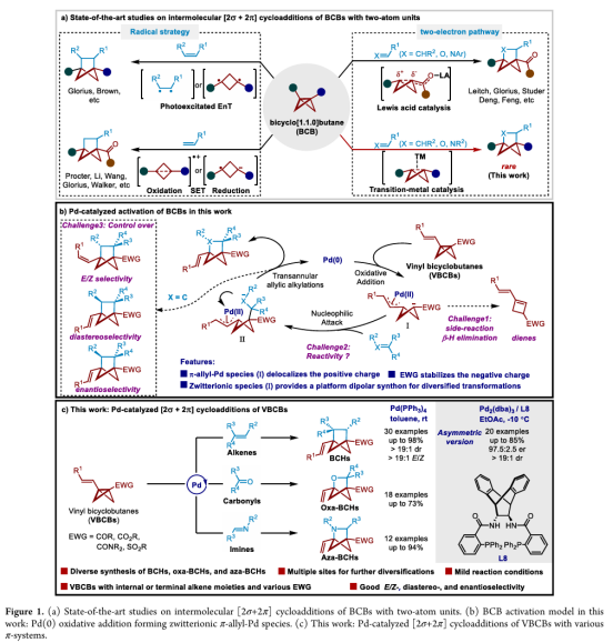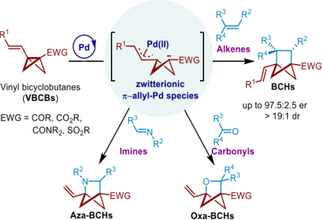 近日,永利集团官网永利集团官网的郑军教授在ACS Catalysis发表了题为“Zwitterionic π‑Allyl-Pd Species Enabled [2σ+2π] Cycloaddition Reactions of Vinylbicyclo[1.1.0]butanes (VBCBs) with Alkenes, Carbonyls, and Imines”的研究成果。该工作开发了烯基双环[1.1.0]丁烷(VBCBs)作为一种通用的合成子,应用于钯催化的[2s+2p]环加成反应,成功实现了与多种2p体系(包括烯烃、醛、酮和亚胺)的环加成反应,多样性地合成了具有潜在药用价值的全碳、氮杂和氧杂环双环[2.1.1]己烷骨架,为进一步新药研发中的苯环生物电子等排体提供了新的合成策略。