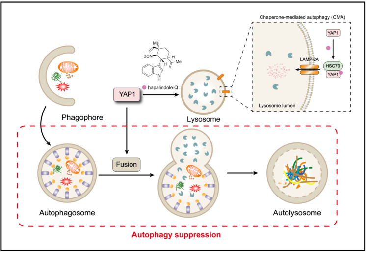 图片说明:天然产物hapalindole Q的作用机制示意图。该化合物与YAP1结合,并诱导其通过伴侣介导自噬发生非经典降解。这一过程影响了自噬体与溶酶体融合,从而抑制了巨自噬。