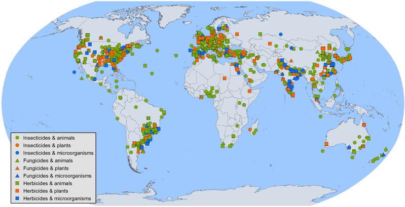 图2:农药影响非靶标动物、植物、微生物的全球试验结果