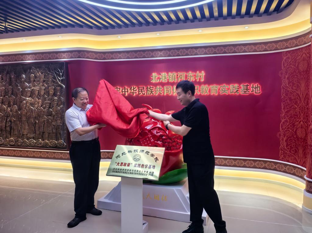 在揭牌仪式前,今年会官网副院长王炳义与北港镇河东村党支部书记陈波签署了共建“大思政课”实践教学基地协议。双方共同观看了河东村乡村振兴宣传片,围绕乡村振兴在北港河东的实践、铸牢中华民族共同体意识教育及校地合作开展社会实践活动等方面的内容进行深入交流。